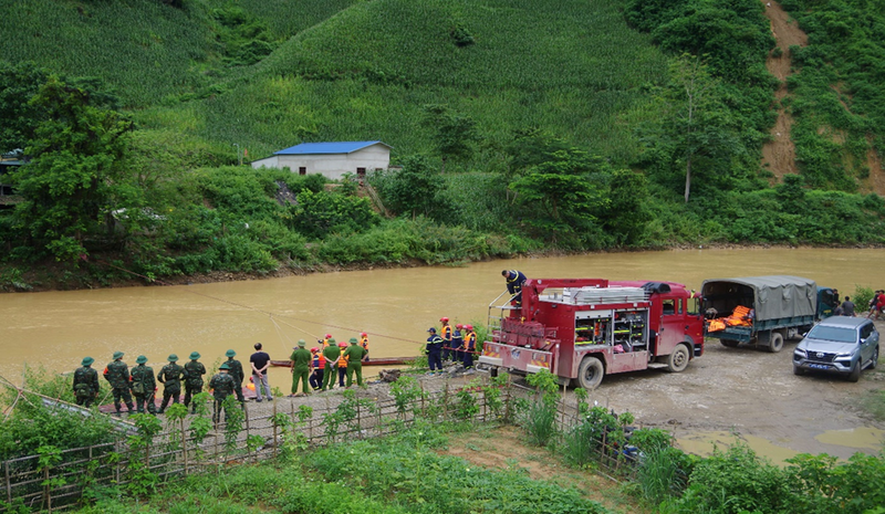 Đến 09 giờ 10 phút lực lượng Cảnh sát PCCC và CNCH có mặt, thành lập tổ trinh sát, tiến hành trinh sát khu vực xảy ra sự cố tai nạn, xác định tình hình ban đầu: dây cáp cầu bị đứt một bên, khiến mặt cầu bị lập nghiêng; 01 xe máy rơi gần bờ, 01 xe ô tô bán tải rơi xuống lòng sông. Thời điểm này, thủy điện xả lũ nên nước sông dâng lên rất cao, dòng nước chảy siết. Lực lượng Cảnh sát PCCC và CNCH đã phối hợp với quần chúng nhân dân cứu kịp thời và đưa 04 người bị nạn đi cấp cứu tại cơ sở y tế. Đồng thời, nhanh chóng triển khai rà soát dấu vết xe ô tô bị nạn, sử dụng 04 xuồng lặn tìm vị trí ô tô mất tích, phối hợp với 02 thủy điện gồm: Thủy điện Nậm Núa 1 tiến hành đóng cửa xả (ngừng phát điện) ngăn chặn nước từ trên đầu nguồn xuống khu vực cầu treo; Thủy điện Nậm Núa 2 tiến hành xả lũ, giảm lượng nước tại khu vực tìm kiếm. Đồng thời phối hợp với chính quyền địa phương, các lực lượng chức năng và quần chúng nhân dân tổ chức rào chắn, đánh giá hiện trạng, đề xuất phương án bảo đảm an toàn tính mạng của nhân dân khu vực bị ảnh hưởng.