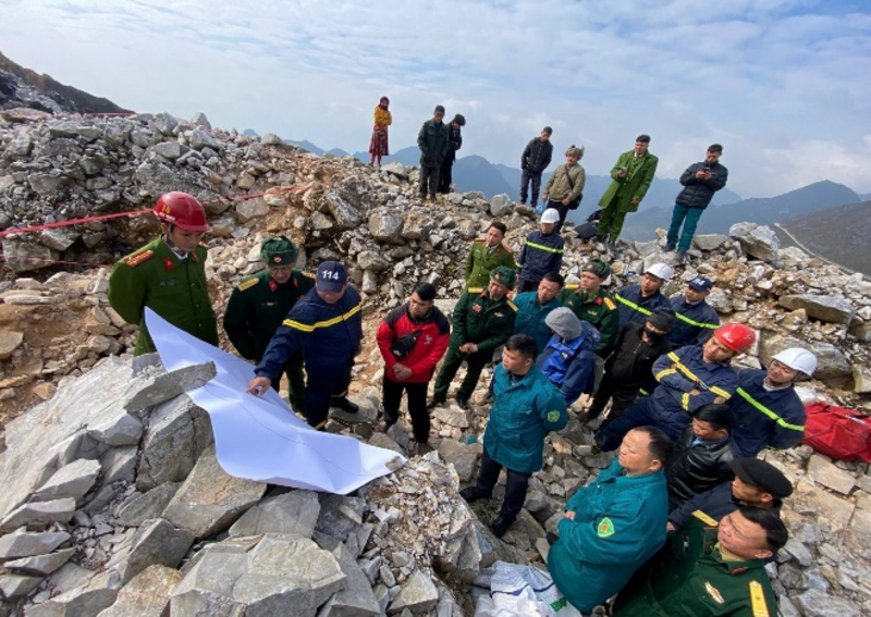 Đồng chí Hải và lãnh đạo, chỉ huy các đơn vị bàn bạc phương án, kế hoạch đưa xác nạn nhân bị mắc kẹt ra khỏi hang sâu.