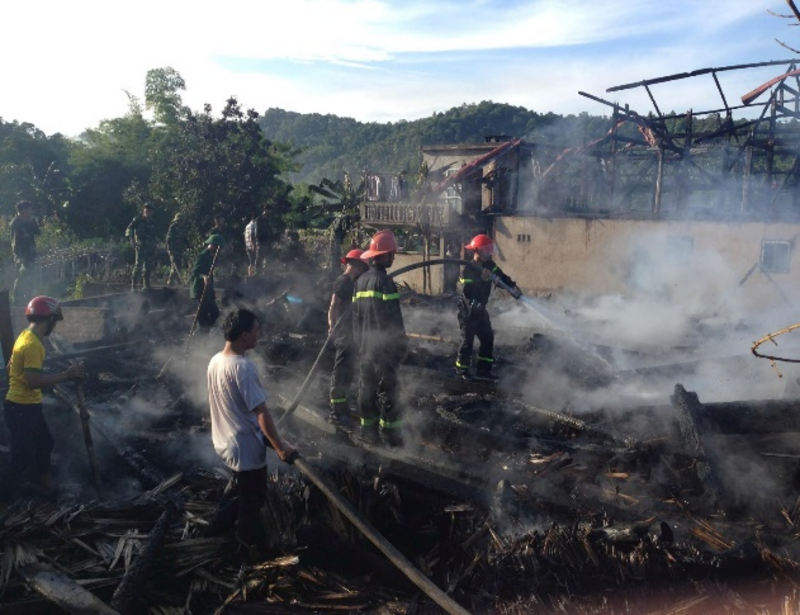 Cán bộ, chiến sĩ Phòng Cảnh sát PCCC và CNCH thực hiện công tác chữa cháy vụ cháy 11 nhà sàn xảy ra tại xã Phú Linh, huyện Vị Xuyên, tỉnh Hà Giang (cũ) năm 2015