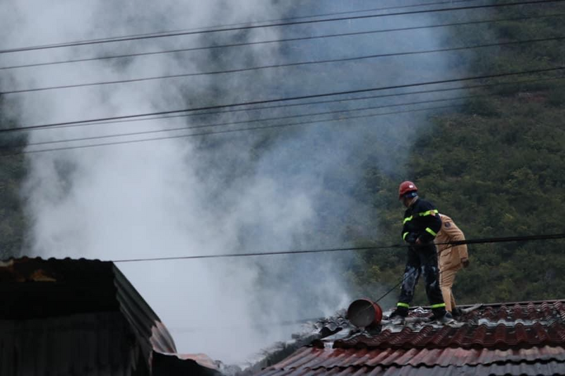 Chỉ huy phá dỡ mái nhà để thực hiện công tác chữa cháy tại nhà dân