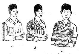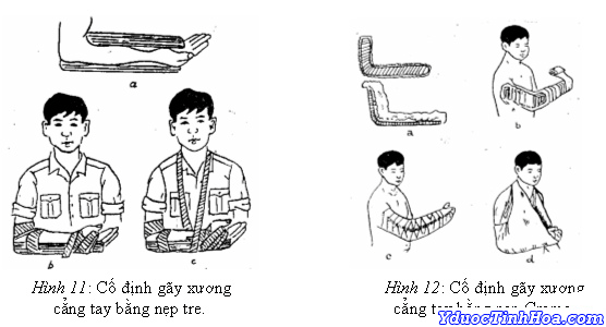 - Nếu không có nẹp thì có thể dùng một băng tam giác, dây hoặc băng cuộn đỡ cẳng tay gấp 90° so với cánh tay và treo trước ngực (nếu không có dây treo ta có thể luồn bàn tay người bị nạn qua khe giữa 2 cúc áo ngực), dùng bang tam giác, dây hoặc băng cuộn thứ 2 buộc ép cánh tay vào thân mình.