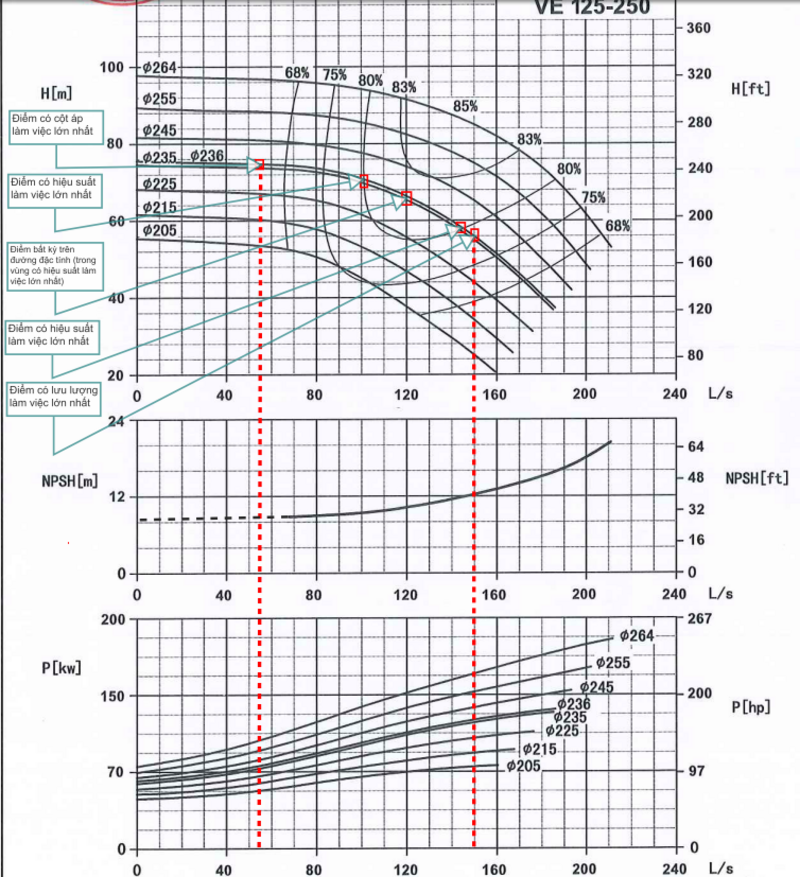 Ví dụ 1: Công bố đặc tính kỹ thuật của máy bơm chữa cháy có đường kính cánh Ø236 mm; lưu lượng làm việc 55 – 150 l/s; cột áp 75 – 58 m.c.n kèm theo đường đặc tính lưu lượng- cột áp, hiệu suất, đặc tính hút, công suất.