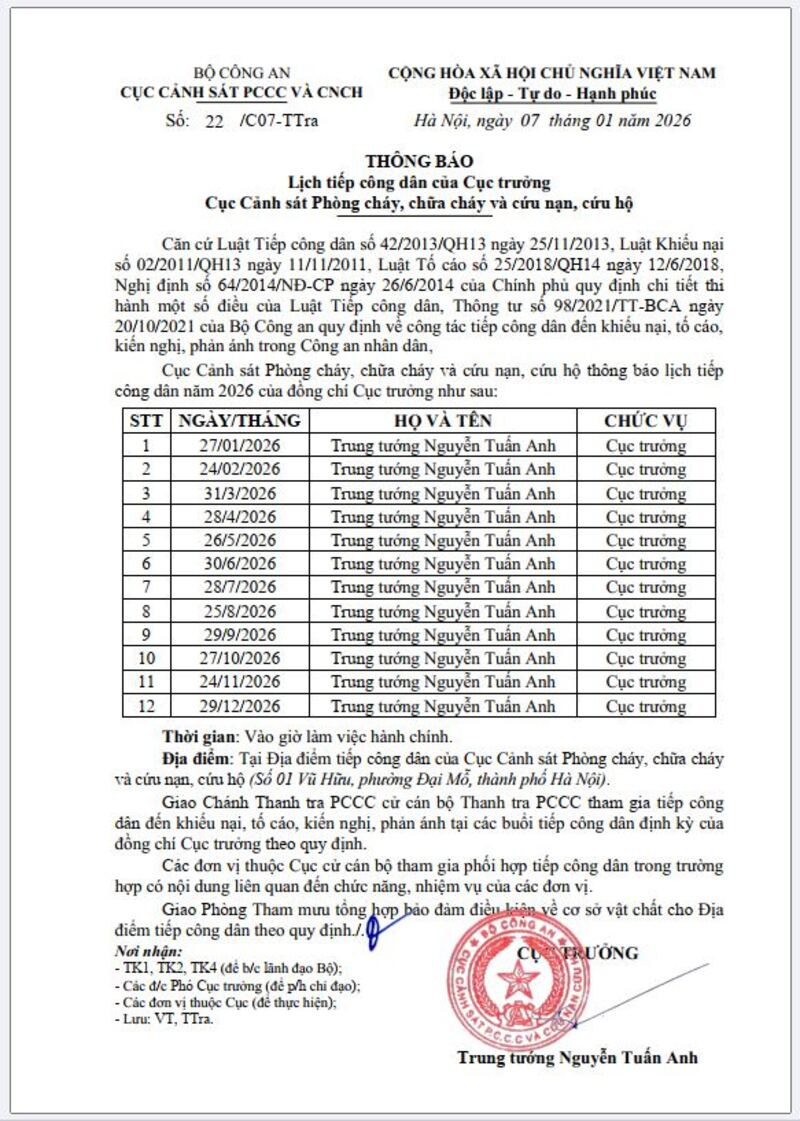 Căn cứ Luật Tiếp công dân số 42/2013/QH13 ngày 25/11/2013, Luật Khiếu nại số 02/2011/QH13 ngày 11/11/2011, Luật Tố cáo số 25/2018/QH14 ngày 12/6/2018, Nghị định số 64/2014/NĐ-CP ngày 26/6/2014 của Chính phủ quy định chi tiết thi hành một số điều của Luật Tiếp công dân, Thông tư số 98/2021/TT-BCA ngày 20/10/2021 của Bộ Công an quy định về công tác tiếp công dân đến khiếu nại, tố cáo, kiến nghị, phản ánh trong Công an nhân dân. Cục Cảnh sát Phòng cháy, chữa cháy và cứu nạn, cứu hộ thông báo lịch tiếp công dân năm 2026 của đồng chí Cục trưởng như sau: