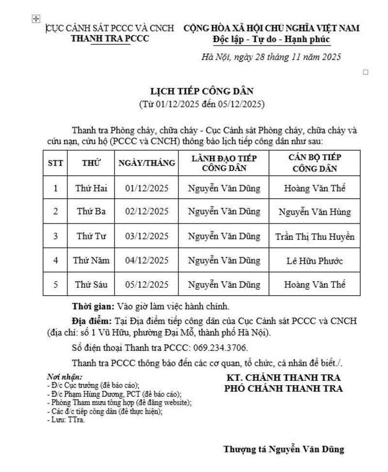 Lịch tiếp công dân của Cục trưởng Cục Cảnh sát PCCC và CNCH năm 2026