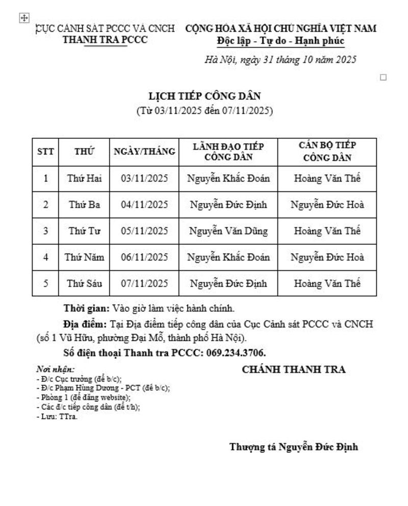 Lịch tiếp công dân (Từ 03/11/2025 đến 07/11/2025)
