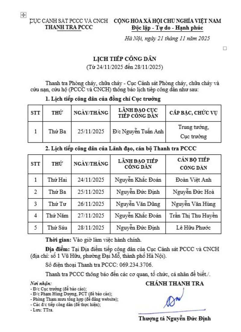 Lịch tiếp công dân của Cục trưởng Cục Cảnh sát PCCC và CNCH năm 2026
