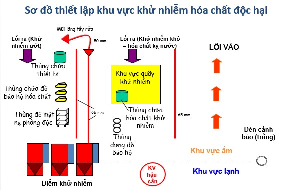 * Khử nhiễm hóa chất: Đây là nhiệm vụ rất quan trọng khi tổ chức xử lý sự cố hóa chất nhằm loại bỏ các hóa chất bám, dính trên người, quần áo và các thiết bị, phương tiện, khu vực sự cố nhằm loại bỏ các tác nhân độc hại ảnh hưởng đến sức khỏe của con người, gây hư hỏng thiết bị, gây ô nhiễm môi trường.