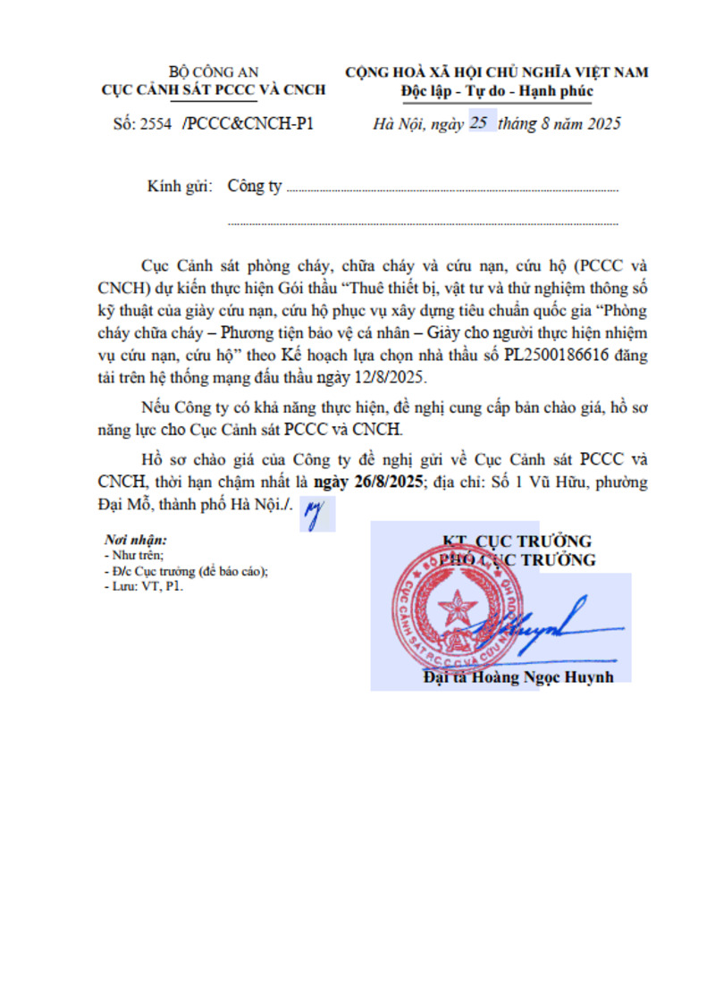 Thông báo: V/v chào giá thiết bị, phương tiện chữa cháy, cứu nạn, cứu hộ phục vụ thực hiện nhiệm vụ hỗ trợ CNCH quốc tế