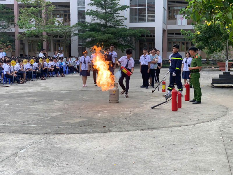 Bên cạnh đó, nhà trường còn tổ chức diễn tập xử lý tình huống giả định, như dập tắt đám cháy do rò rỉ khí gas. Những khẩu lệnh dứt khoát, bước chạy nhanh nhẹn, sự bình tĩnh trong từng thao tác của lực lượng tham gia diễn tập đã thể hiện tinh thần trách nhiệm, tính chuyên nghiệp và sự phối hợp chặt chẽ giữa nhà trường với lực lượng Cảnh sát PCCC và CNCH. Mỗi hoạt động không chỉ giúp rèn luyện kỹ năng thực tế mà còn góp phần giáo dục học sinh về tinh thần kỷ luật, ý thức đoàn kết và trách nhiệm đối với cộng đồng.