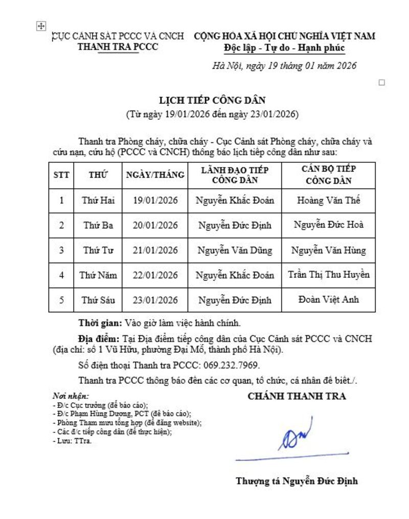 Lịch tiếp công dân của Cục trưởng Cục Cảnh sát PCCC và CNCH năm 2026